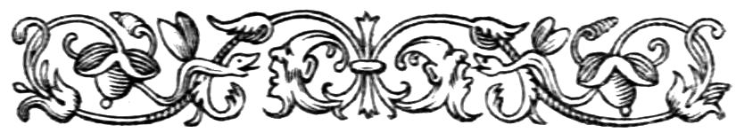 On the lower band, standing one at each side of a short pedestal, or rather low dado, are, back to back, two bearded grotesques, each of which is made up of a human head and face having three goats’ horns growing out of the forehead, and of a wyvern’s body, holding aloft in one of its claws a tall tapering torch. Further on comes a series of spaces peopled with emblematic personages, and separated from one another by two little naked winged boys standing on a highly elaborate zocle, and with the left hand swinging by a cord, at each end of which hang from a ring, and done up in bunches, fruits and flowers. In the first space is “Prudentia,” bearing in her right hand a long-handled convex mirror, in her left, a human skull; in the second space, upon a sort of throne, sits “Sollicitudo,” upholding in her right hand an oblong square time-piece, while on her left, with her elbow propped up by one arm of her chair, she leans her head as if buried in deep thought; in the third space sits “Animi-(Probitas)” with both her arms outstretched, as if reprovingly; in the fourth space we have “Ceres,” the heathen goddess of corn: crowned with a wreath of the centaurea flowers, she carries ears of wheat in her right hand, in her left, a round flat loaf of bread; in the fifth space, “Liberalitas,” who, from the emblems in her hands, must have been meant to personify not generosity but freedom, for in her right hand she shows us a hawk’s jesses, with the bells and their bewits, and on her left wrist, or, as it should be phrased, the “fist,” the hawk itself without jesses, bells, lunes, or tyrrits on—in fact quite free.