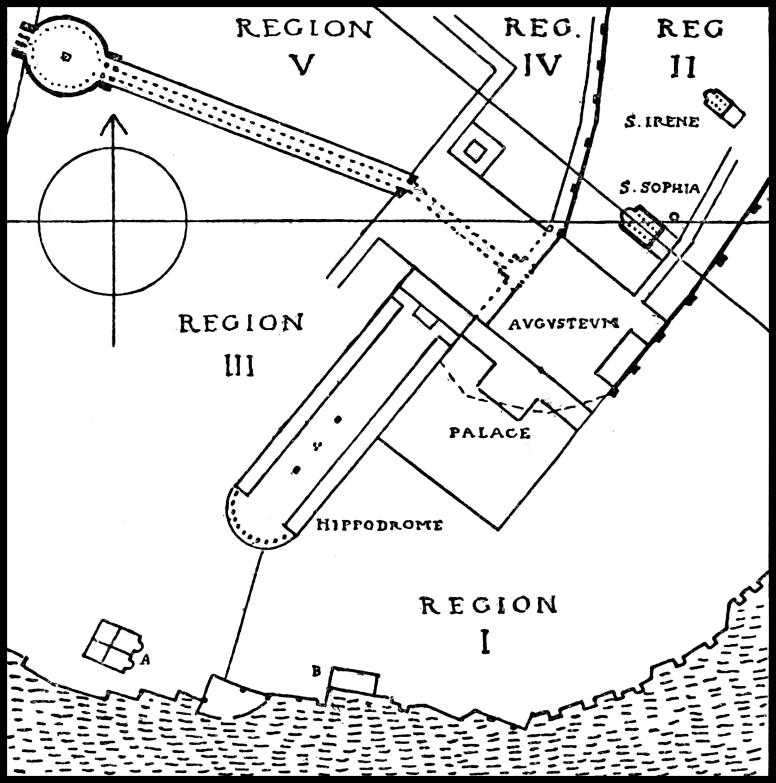 Augusteum.—Thus Region I., occupying the land between the Acropolis wall and the sea, was partly reserved for palaces; Region II. coincided with the Acropolis, and had its south end devoted to the Forum Augusteum and the Christian Basilicas of S. Sophia (“the Great Church”) and St. Irene (“the Old Church.”). It will be observed that in the Notitia the Augusteum is given to Region IV., to which it does indeed adjoin; Mordtmann[18] considers that the Augusteum, like the buildings round it, must have belonged to Region II., but suggests that there may have been a continuation of the open space farther to the west in Region IV., and some such space as this certainly seems required by several of the references.