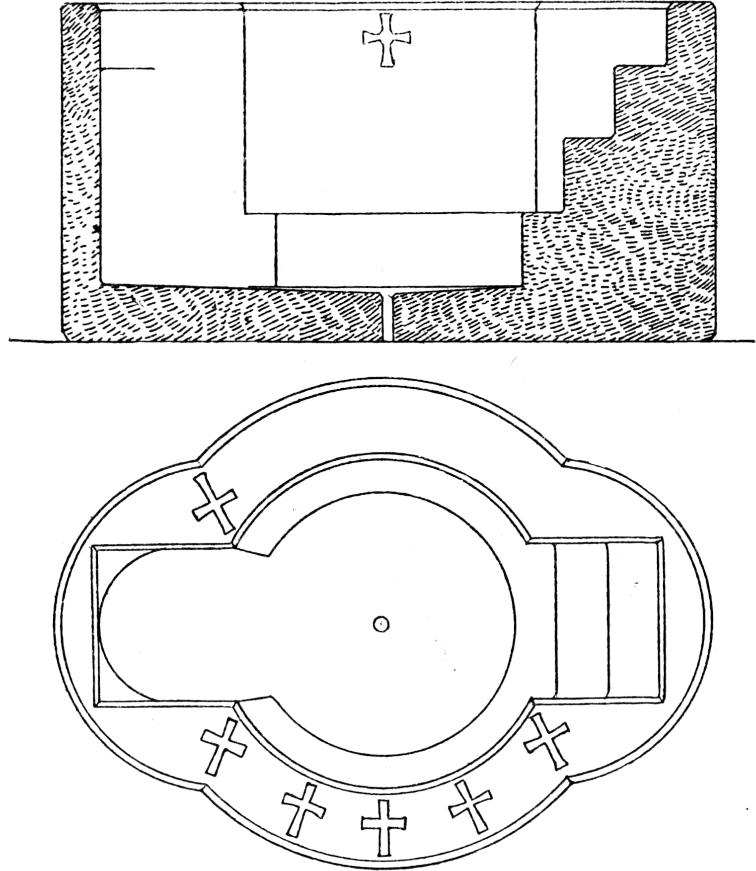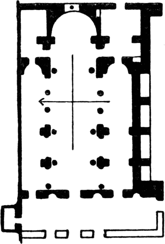 In applying the plan of a church of mean size so that the doors should face eastwards, we are at once struck by finding that the western hemicycle of the present church would lie about the apse; and we cannot but suggest that in this we may have the very raison d’être of the remarkable plan of the present church, which it would seem might be properly classed with those churches which have apses at both ends, like the early basilica at Orleansville near Tunis;[39] the MS. plan of S. Gall is the best known example; our own early church at Canterbury was another instance, the result of adding to a church with a western apse; France furnishes Besançon and Nevers, and Germany numerous examples.