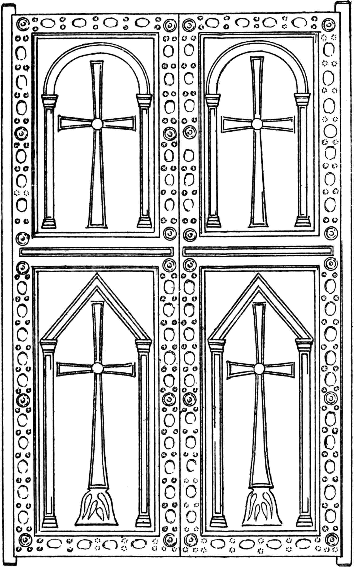 Socrates († 440) says of the church of Antioch that “the altar stood not at the east but at the west,” but he speaks of[Pg 18] this as contrary to the usual custom at the time he wrote. This church was founded by Constantine and finished by his son. The Church of the Apostles at Constantinople, built by Constantine to contain the relics of S. Luke, seems also to have been entered at the east, for S. John Chrysostom[35] speaks of the emperor being buried “in the part in front of the doors,” and an anonymous author, who wrote about the imperial sepulchres, says that Constantine’s sarcophagus was “in front towards the east.”[36]