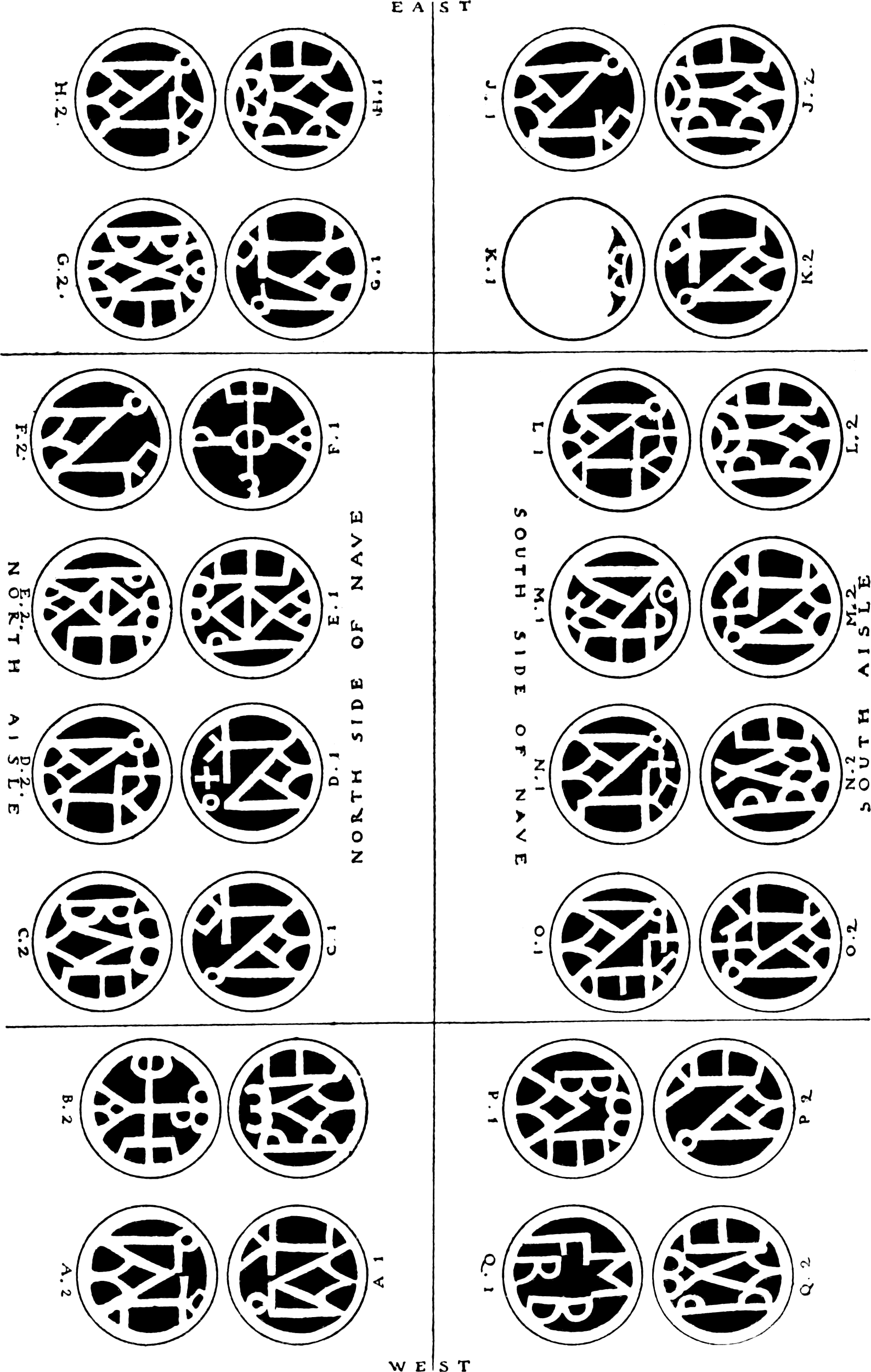 [414] In our illustration the same capital is distinguished by a letter, the two sides by 1 and 2, the monograms reading in the direction of the reference to their position. Those of “N. Aisle” for instance read from left side of page.