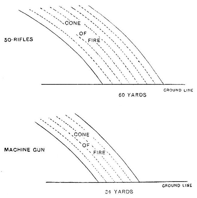 In comparing the volume of fire of the machine gun with that of a body of infantry, it is obvious that “rapid” cannot be taken as the normal rate of infantry fire, as it can only be used for the shortest periods, and even then it reduces the users to a state of inefficiency as regards accuracy in two or three minutes. On the other hand, “rapid” fire can only be used by the machine gunner on special occasions, for tactical reasons which will be explained later, so that it will be necessary to compare “slow” infantry fire with “deliberate” fire from the machine gun, in order to arrive at the mean fire volume of each. Seventy shots a minute can easily be fired “deliberately” from a machine gun, and this could be increased to 120 by highly trained gunners, but, taking the lower figure, deliberate fire equals in volume the fire of twenty-four men using rifles. But it must be always remembered that the object of the fire fight is to bring a concentrated and overwhelming fire to bear at the right moment on certain positions of the enemy, and when the moment arrives machine guns can and will use the most rapid rate of fire possible, which will be from 250 to 300 rounds a minute or equal to[8] that of 50 or 100 riflemen. Mere volume of fire, however, is useless without control, accuracy, and concentration, and it is here that the machine gun is so vastly superior to the rifle; for amongst 50 men using their rifles there can only be a small percentage of good shots, while even among the good shots unforeseen factors, such as fatigue, bad fire positions, excitement, wrong sighting, failure to see the target, etc., cause a large percentage of the shots to go astray, and make it very difficult to concentrate the fire on any particular position of the enemy.