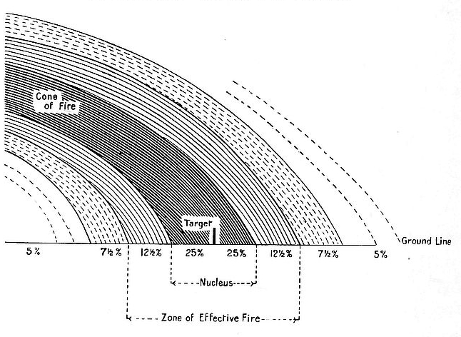 In order that “fire” may be “effective,” it is necessary to bring the enemy within the zone[6] beaten by 75 per cent. of shots, and it has been found by experiment that 25 per cent. of shots fall immediately in front and behind the target, then 12½ per cent., 7½ per cent., and, finally, 5 per cent. scattered far in front and behind.
