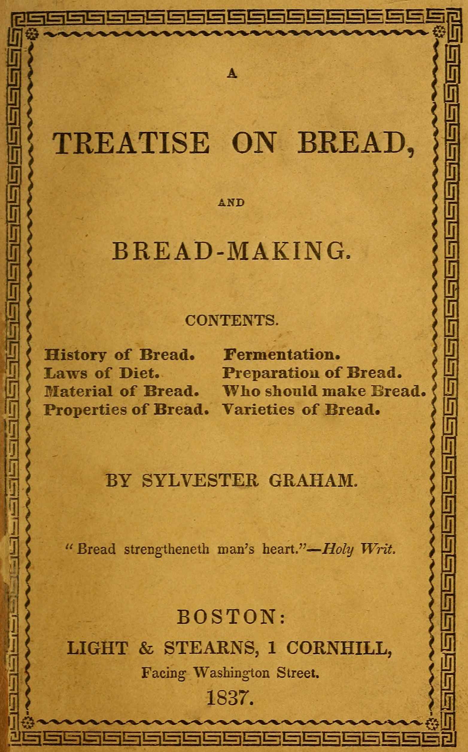 If we contemplate the human constitution in its highest and best condition,—in the possession of its most vigorous and unimpaired powers—and ask, what must be the character of our bread in order to preserve that constitution in that condition? the answer most indubitably is, that the coarse unleavened bread of early times, when of proper age, was one of the least removes from the natural state of food,—one of the simplest and most wholesome forms of artificial preparations, and best 27adapted to fulfil the laws of constitution and relation; and therefore best adapted to sustain the most vigorous and healthy state of the alimentary organs, and the highest and best condition of the whole nature of man, as a general and permanent fact; and hence it is very questionable whether loaf or raised bread can be made equally conducive to all the interests of our nature, with the simple unleavened bread.