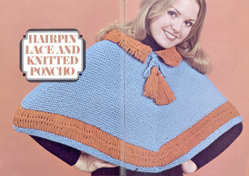 With B and 3 inch Hairpin Staple, work a strip of hairpin lace having 74 loops on each side of staple. Fasten off. With Size H hook, attach B in first loop, keeping 1 twist in each loop, work 1 sc in each loop along one edge. Fasten off. Having right side of poncho and collar facing, sew sc edge of collar to poncho, matching edges at center front seam.
