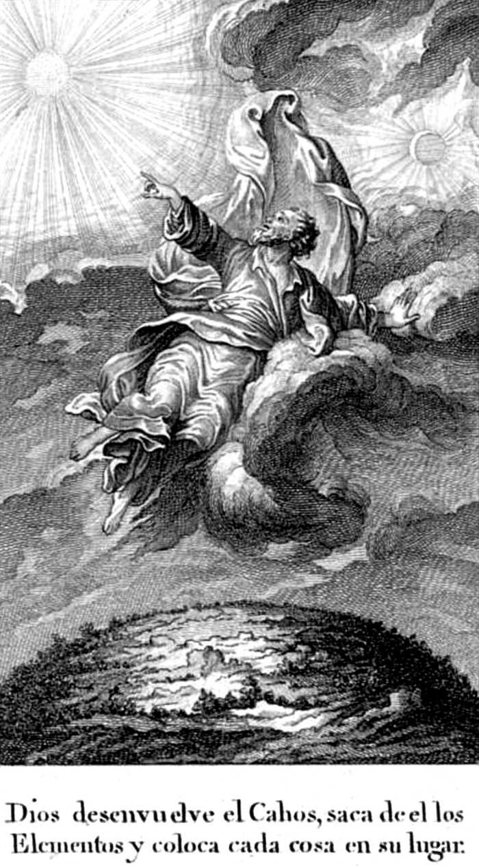 | Estampa 3: | Dios desenvuelve el Chaos, saca de él los Elementos y coloca cada cosa en su lugar. |