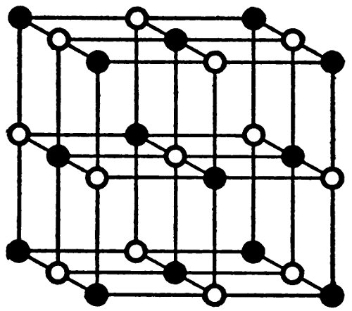 Arrangement of sodium and chlorine “atoms” in a crystal of common salt.