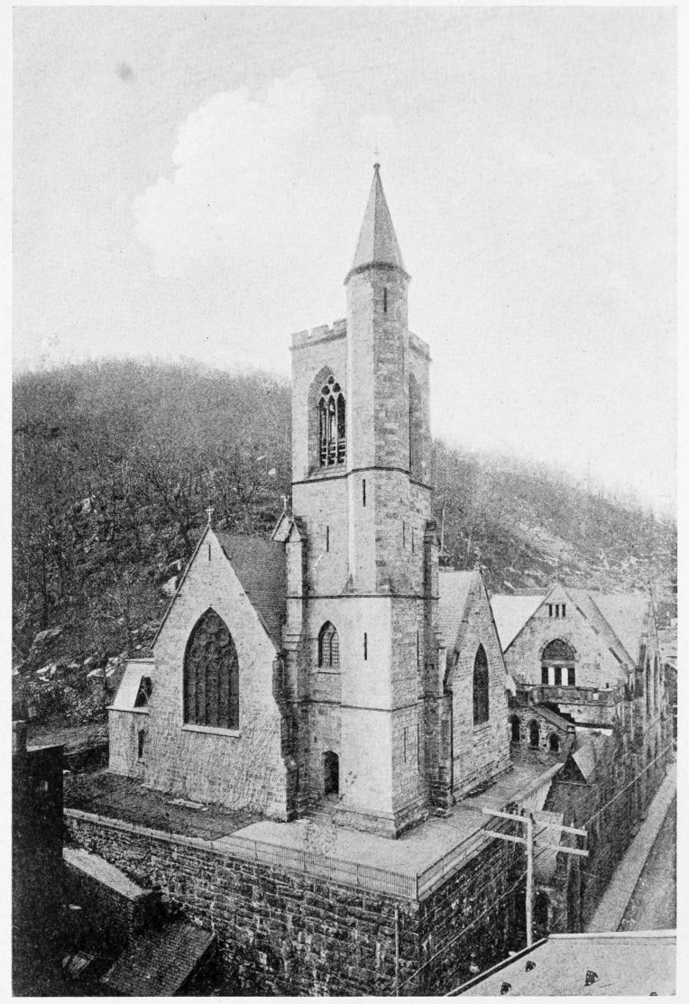 Mauch Chunk, county seat, population 3666; Indian name means Bear Mountain; first settled in 1815; has one principal street, following the tortuous course of Mauch Chunk Creek as it winds through a narrow gorge between three high, steep, and rocky mountains, averaging 850 feet above the town. The important buildings are directly on this street. Courthouse, Norman, brownstone, quarried at Rockport, Carbon County; built in 1894. Jail, where some of the Molly Maguires were executed. The Dimmick Memorial Library, built in 1890, brick. Churches here and in East Mauch Chunk are unusually handsome. St. Mark’s Protestant Episcopal, Gothic, stone, has memorial windows by J. & R. Lamb; the reredos is very beautiful. First Presbyterian, colonial, brick, has a memorial window by John LaFarge, and one by Tiffany. The Immaculate Conception, Roman