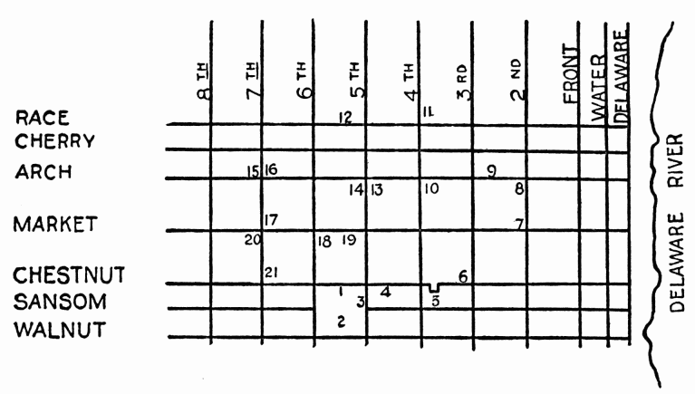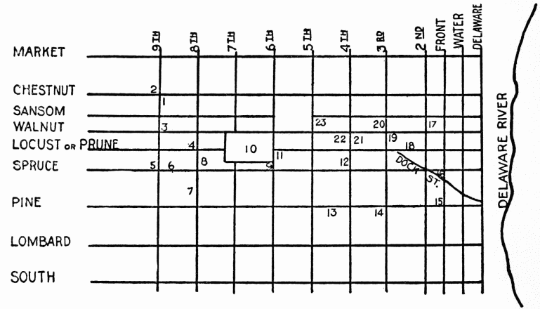 The first lightning rod was placed upon the home of its inventor, Benjamin Franklin, at 141 (now 325) Market Street, in 1749.