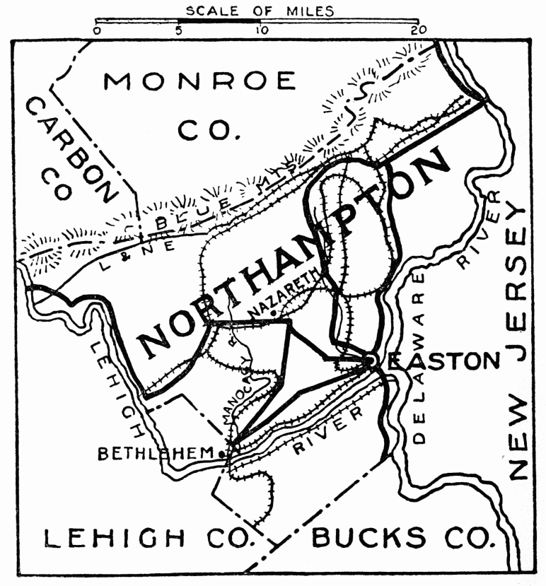 In 1756 Benjamin Franklin was authorized by the Provincial Government to erect forts on the Lehigh; one opposite Gnadenhütten was named Fort Allen, for William Allen, the Chief Justice. At Weissport, in the rear of the “Fort Allen House” may be seen the well dug under Franklin’s supervision; it was within the inclosure of the fort and supplied the soldiers with water. Weissport was settled by Colonel Jacob Weiss, Quartermaster General in the Revolutionary Army, on site of Fort Allen. Municipal parks are at Lehighton and Weissport, given by Jacob Weiss. Also at Lehighton is All Saints’ Chapel, early English Gothic.