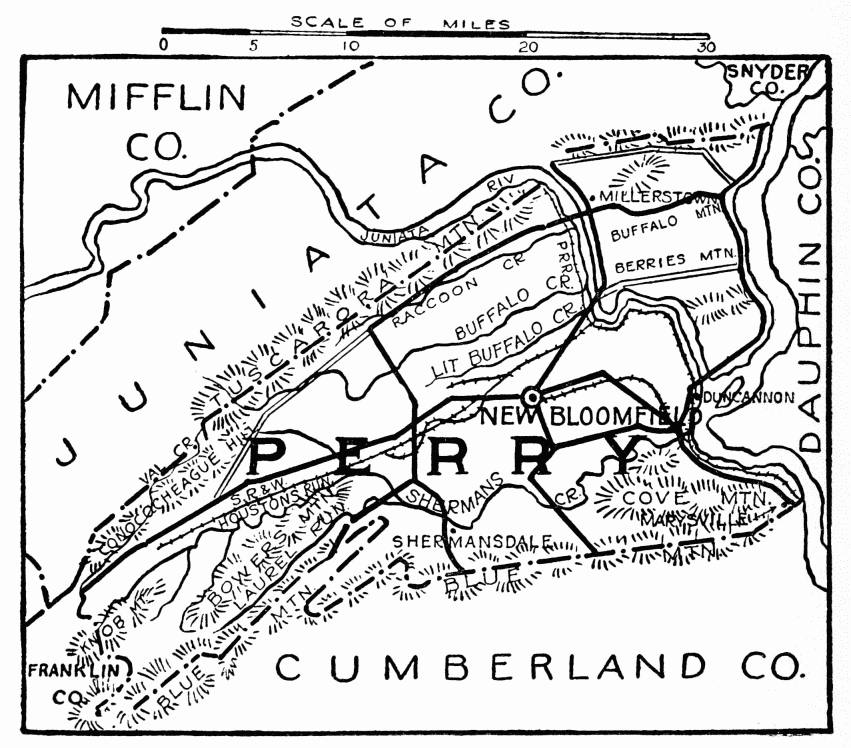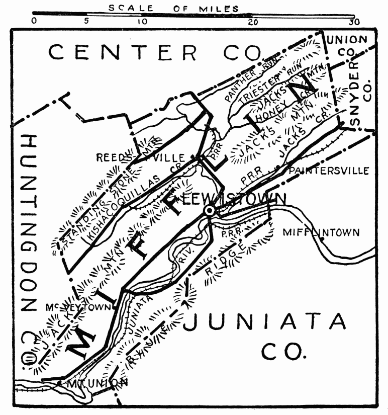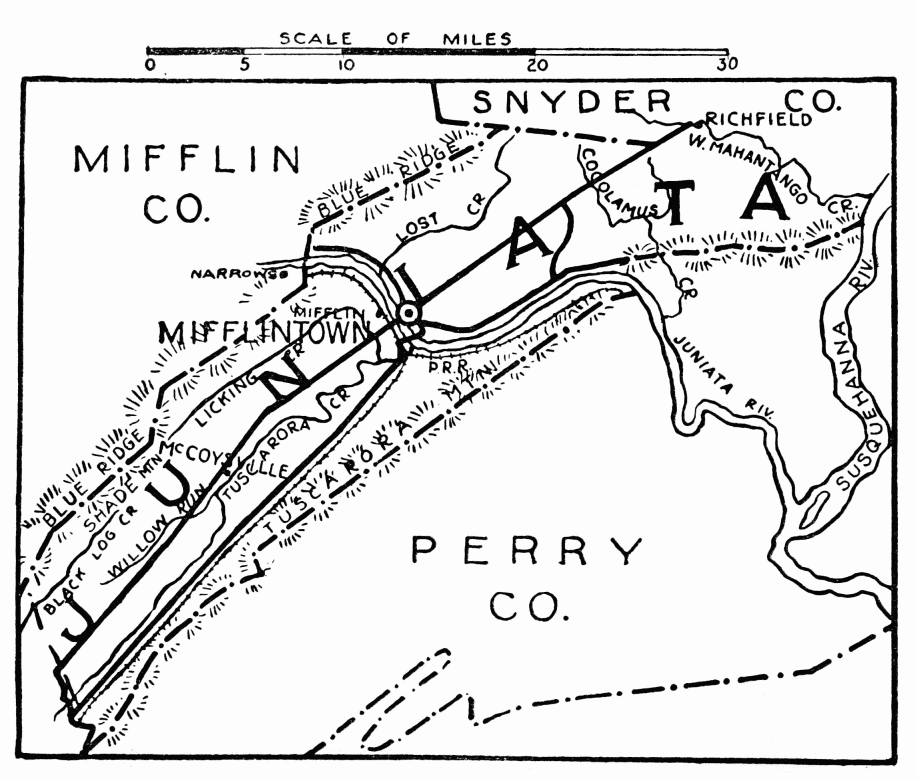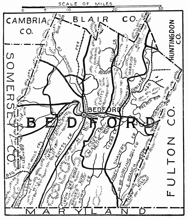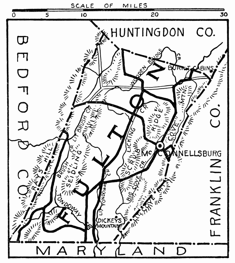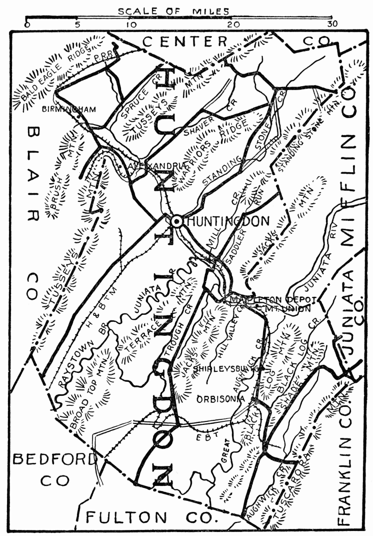 In the days following Braddock’s defeat in 1755, this region became the arena in which the red warrior of the forests and the white frontiersman fought to the death. Not a valley, creek, nor mountain range, site of modern city or town, but what was the scene of thrilling events, some of which influence the world for all time. Early settlers were Scotch-Irish, on the Aughwick, and in the great cove. Chief industries, iron ore, bituminous coal, and agriculture. Dickey’s Mountain, in the southeast, is rich in hematite and fossil ores.