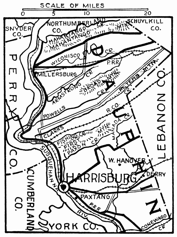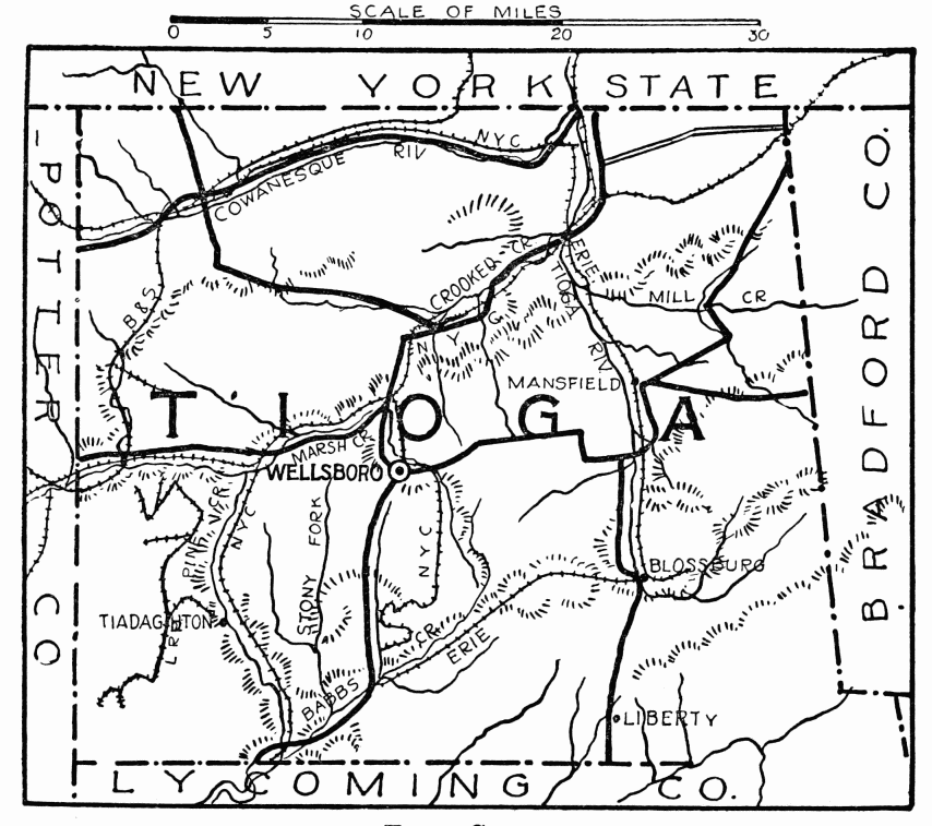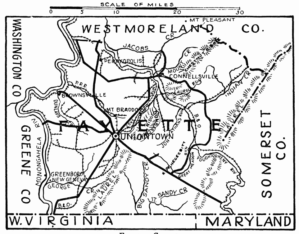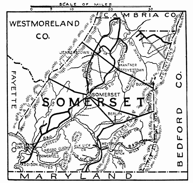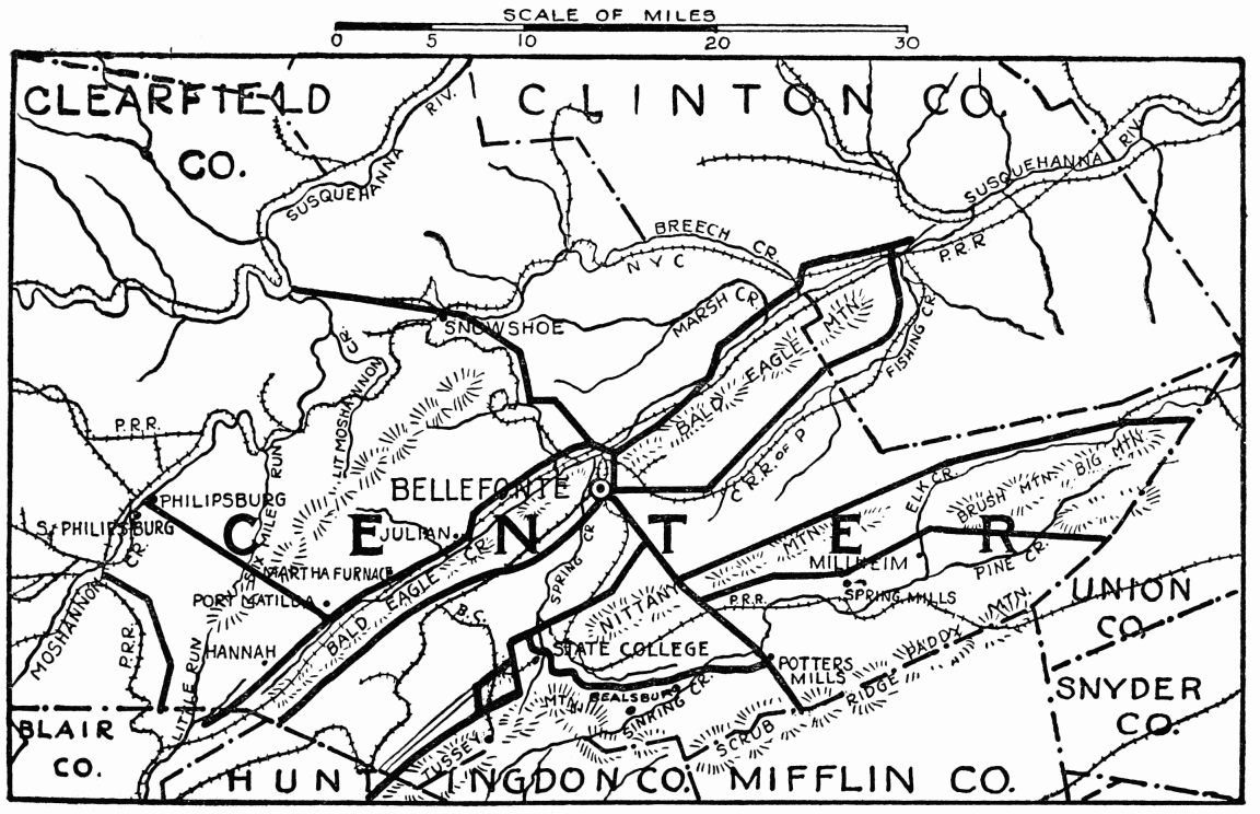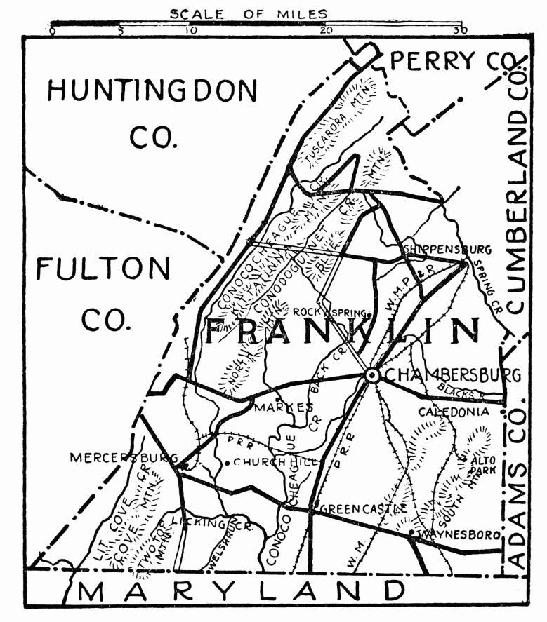 In the days following Braddock’s defeat in 1755, this region became the arena in which the red warrior of the forests and the white frontiersman fought to the death. Not a valley, creek, nor mountain range, site of modern city or town, but what was the scene of thrilling events, some of which influence the world for all time. Early settlers were Scotch-Irish, on the Aughwick, and in the great cove. Chief industries, iron ore, bituminous coal, and agriculture. Dickey’s Mountain, in the southeast, is rich in hematite and fossil ores.
