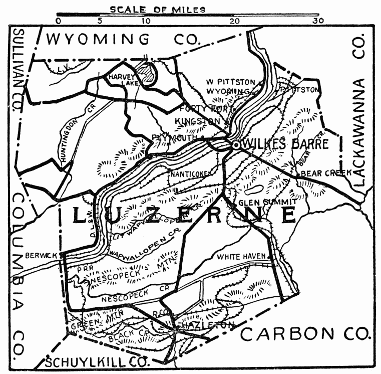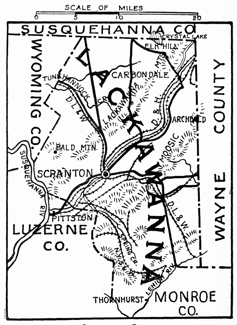 FORMED August 13, 1878; named for the great Lackawanna coal basin; an Indian word, signifying “The Forks of a Stream.” Chief industry, anthracite coal mining, confined to the long-depressed trough forming the Lackawanna Valley and to the mountains bordering it on both sides, with Bald Mountain, in Lackawanna Range, 2250 feet high, and Big Stoney among the Moosic Mountains, 2230 feet. Originally settled by Connecticut people who disputed the right of Pennsylvania to jurisdiction; life and growth have been the result of the coal-mining industry, which brought into it large numbers of Welsh, Irish, German, English, and Scotch, whose descendants dominate the region; latterly have come Polish, Slavs, Italians, and Lithuanians, a heterogeneous but rapidly assimilating mining population.