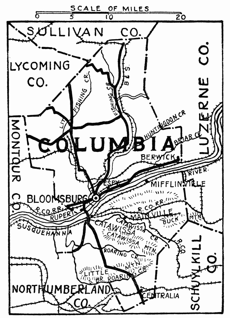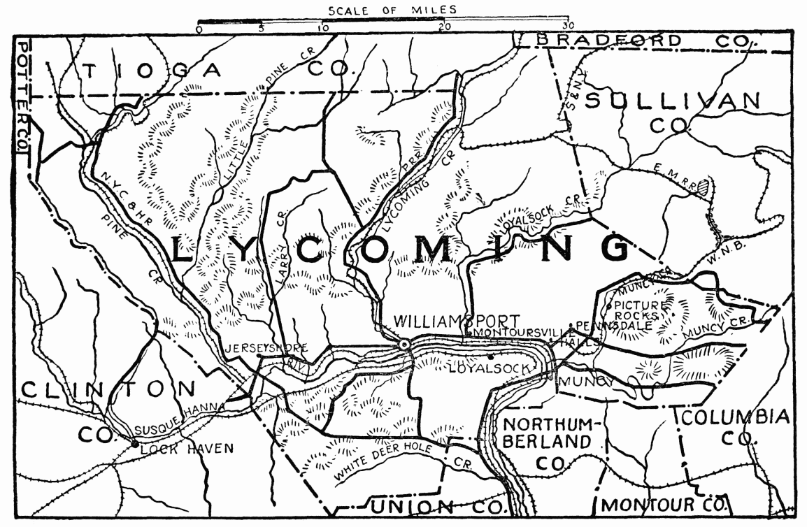 At the top of the mountain, on the road toward Sonestown, is “Fiester’s View,” where the deep valley of Muncy Creek, walled on the east by the towering North Mountain, 3000 feet above tide, near Nordmont, is beautiful beyond description. At the junction of the Big and Little Loyalsock Creeks is the pretty little town of Forksville. Dr. Priestly purchased a large tract of land about here, laid out roads, and made many improvements. Four miles distant, on the state highway toward Hillsgrove, on Kings Creek, is Lincoln Falls, a waterfall about 30 feet in height at the head of a gorge with perpendicular walls of rock, varying from 50 to 80 feet in height. A few deer, quite a number of bear, foxes, rabbits, and squirrels are in this county; a state game preserve is in the southeast near Jamison City. There are some good trout streams, and the lakes are well stocked with fish. The most valuable industry is coal from the Bernice coal fields in the east. The production of hemlock tanned sole leather is important. Farm products and dairying are general.{480}
