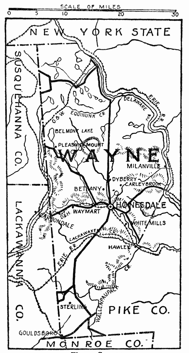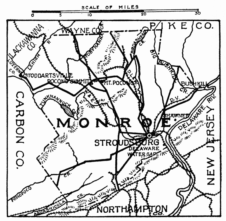 The country northwest has well-cultivated farm lands; that, southeast, blends with the Pocono Highlands, is wild and picturesque; an almost unbroken wilderness for thirty miles, excepting along the line of the Delaware, Lackawanna & Western Railroad; on both sides of this road are good highways; the main road, the whole length of the valley, is exceptionally fine. The road from Gouldsboro Station was built by Jay Gould, 1855, when he was interested with Mr. Pratt in a tannery at Gouldsboro (now Thornhurst).