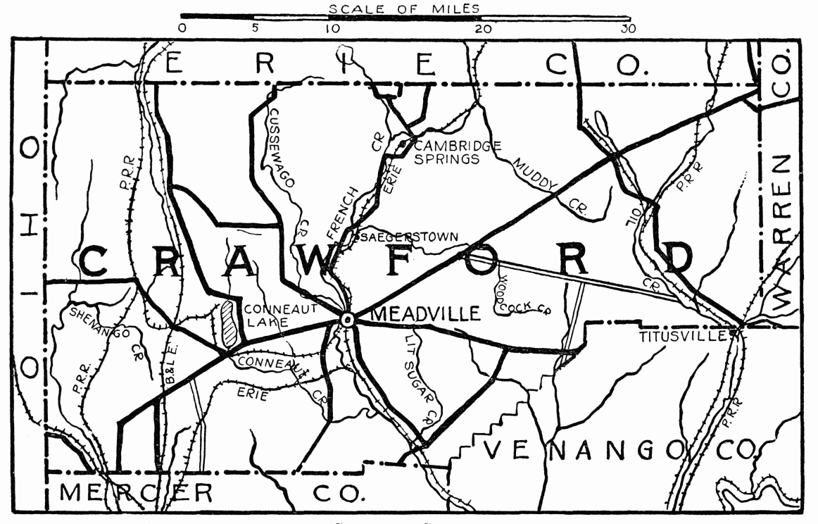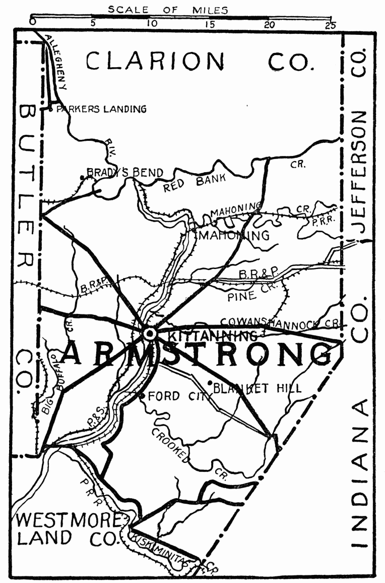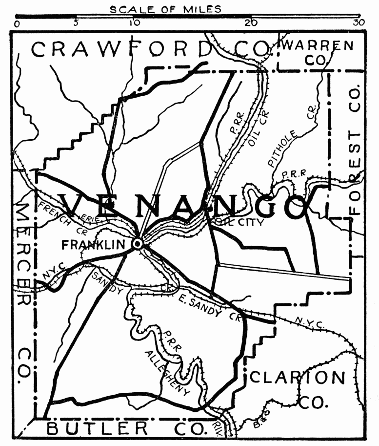 In early days this region was called “The Iron City,” on account of its many furnaces; forty were in operation at one time, they are now cinders and banks of earth. The oil production in this county has been wonderful;{454} 5000 oil wells were drilled in Clarion after 1870, and there is still much wealth in it; other industries are gas, coal, and agriculture. Two long tunnels are at Madison Furnace on the railroad between Clarion and Franklin; it is said there are but two longer ones in the world. The first bridge was built across Clarion River in 1834. The present one, which is of fine construction, is the third.