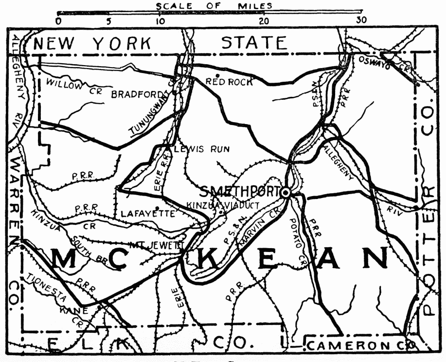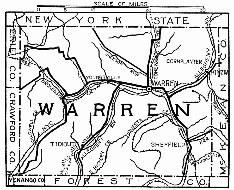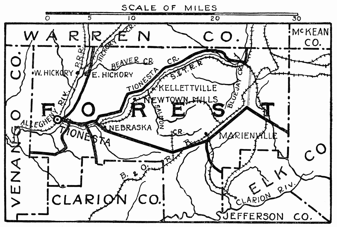 FORMED April 11, 1848; named for its great variety of timber; hemlock and pine, east; dense forests of deciduous trees west along the Allegheny River. Game large and small abounds; streams are full of brook trout. Atmosphere is fragrant with health-giving ozone, strengthening the weak and restoring those affected with lung trouble. Chief industry is lumbering; in western part agriculture, and the growing of fine apples.