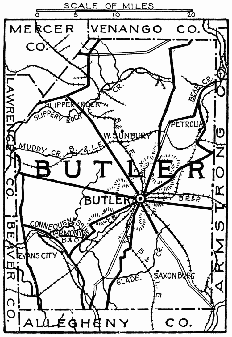 The chapter of each county was written by a most responsible person, who lived there, judges, clergymen, historians, and a few by officers of the women’s clubs, thus giving inside knowledge that a stranger could never get. All dry-as-dust statistics are omitted, and only that which is of prominent interest is given.{viii} Authorities consulted have differed, and mistakes will occur; there will be sins of omission and commission in the work, according to the point of view of the reader; but they are few in comparison with the wealth of real information brought together within this cover.