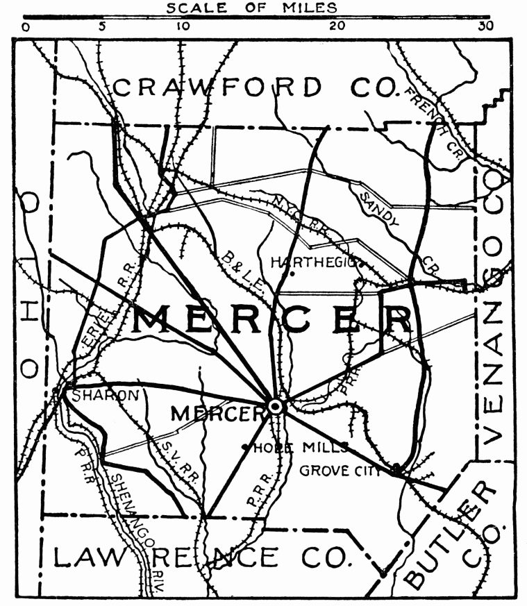 Cascade Park has great natural beauty. A part of the beautiful Slippery Rock is in the southeast of this county. At Mount Jackson is Battery B Monument in honor of the Round Head Regiment. New Wilmington, population 8861, has Westminster College, under United Presbyterian administration; near here was the McKinley blast furnace, owned and operated by President McKinley’s father. His son worked here as a boy.{489}
