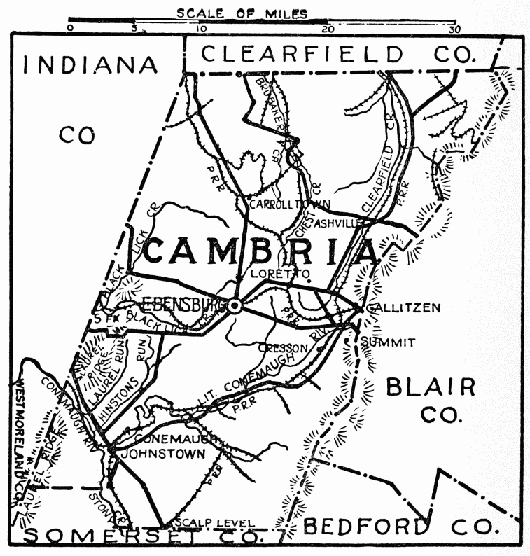 Near junction of Sugar Run with Burgoon’s Run, three miles south of Altoona, in 1781, Indians killed a number of militiamen from Fetter’s Fort, built in{475} 1775, by firing on them from ambush. A monument dedicated in 1909, marks the place where the wife of Matthew Dean and three of their children were killed by Indians in 1788, while he and the other children were working in the fields. In Blair County are also sites of Fort Roberdeau, built, 1778, and Fort Lowry, 1779, unmarked. Magnificent views from Nopsononock, at summit of the Alleghenies, Prospect Hill, and Kittanning Point, where the Pennsylvania Railroad is carried around the famous Horseshoe Curve. A little farther, the Pennsylvania Railroad passes through a tunnel two-thirds of a mile long, 2160 feet above sea level.