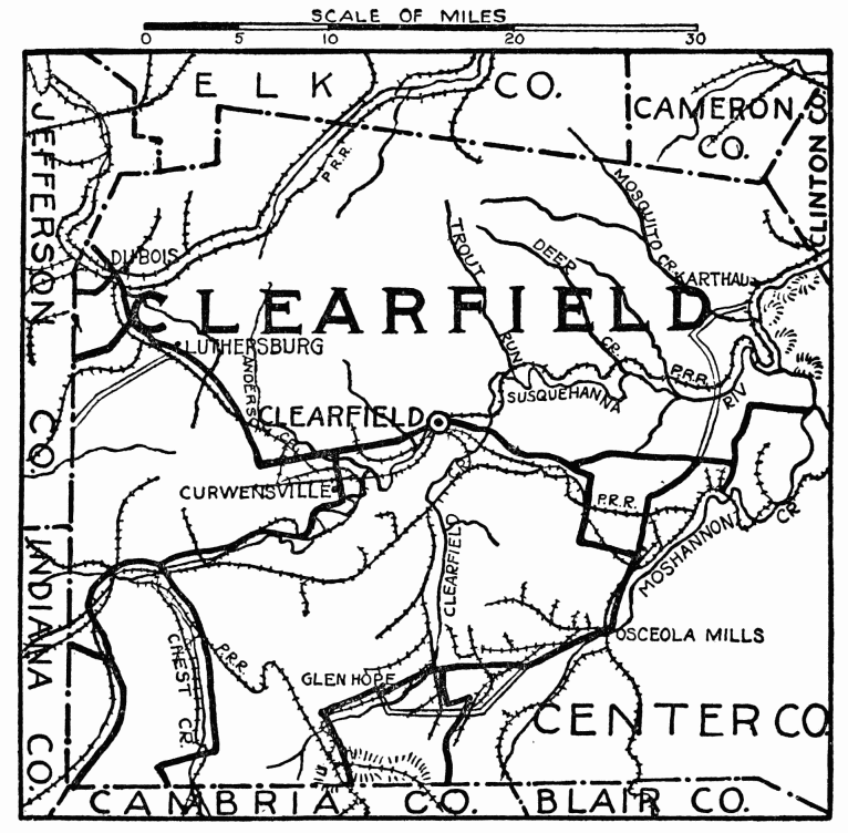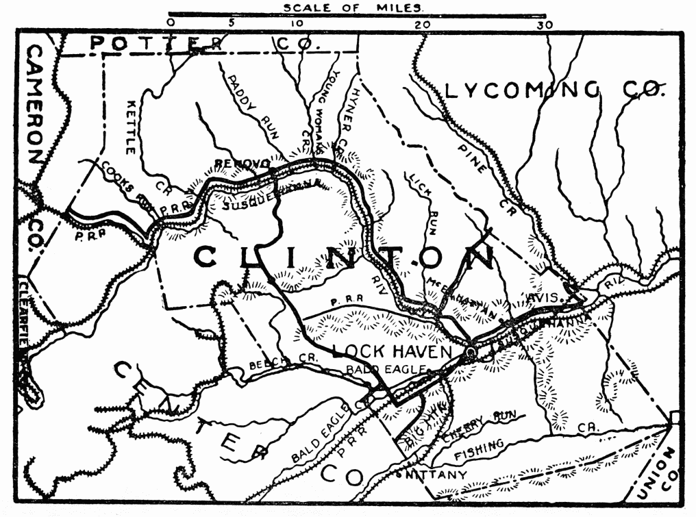 FORMED June 21, 1839; named for DeWitt Clinton. Has superb scenic beauty; lofty mountains, rolling hills, and highly productive valleys border the West Branch of the Susquehanna River. About one-fourth is State Forest Reserve of mountainous wilderness, where large and small game, trout, and other fish abound. Chief industries are in vast deposit of commercial clay, from which is made fire, building and paving brick, tile sewer pipe, and concrete blocks; and a large chemical plant, very important in war chemicals; agriculture, including tobacco growing; several creameries and a large milk condensery.