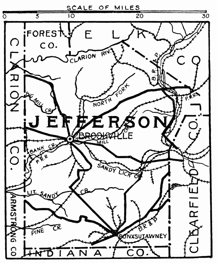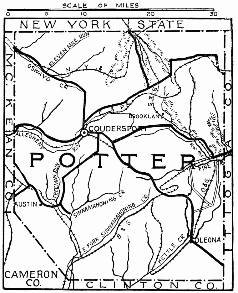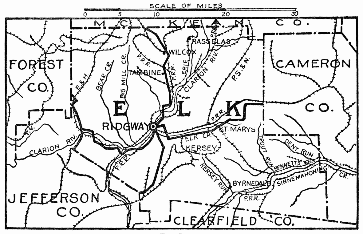 FORMED April 18, 1843; possesses everywhere great scenic beauty; a large herd of elk, last-known herd of the Black Forest, still existed, for which the county was named; the last elk was killed in 1857. The Black Forest formerly covered a vast area of northwest Pennsylvania, the deep green of the hemlock giving a mystery of blackness; here many varieties of large and small animals abounded. Climate and geological formation differ from surrounding counties in ratio of altitude; the growing season is usually two or three weeks later on account of late frosts; agriculture is now chief industry. Bituminous coal was discovered by “Blind Mike” on Priest’s Land at St. Mary’s in 1853, and is continuously worked. Natural gas, oil, high-grade clays, and shale are other mineral resources. Jimanandy Park, 3600 acres of almost virgin forest, stocked with deer; through which a trout run flows, is the property of heirs of Senator James K. P. Hall, and Honorable Andrew Kaul; permission to inspect the park may be obtained at office of J. R. P. Hall at St. Mary’s.