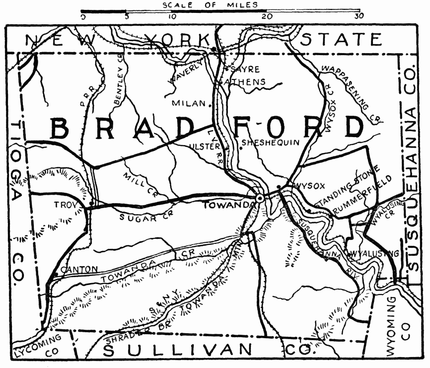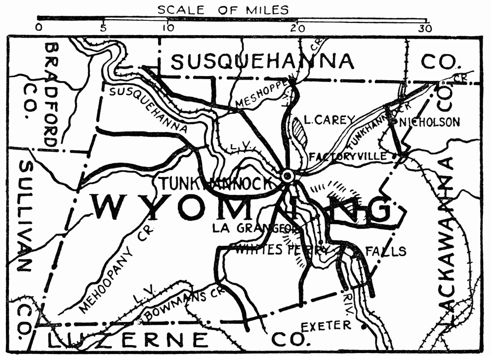 This beautiful setting was the scene of Indian plottings that culminated in the Wyoming Massacre in 1778 (see Luzerne County). The following year General Sullivan’s army passed through this region, on march to subdue the Six Nations, and encamped on the shore of the Susquehanna River at Tunkhannock, where the tannery now stands. Forty years ago passenger pigeons were so plentiful that when they flew across a town in dense flocks, they obscured the sun; one colony occupied a strip of woodland in{462} Wyoming County, seven miles long by three miles wide; Alexander Wilson wrote of counting ninety nests in a single tree. Chief industries, agriculture and manufacturing.