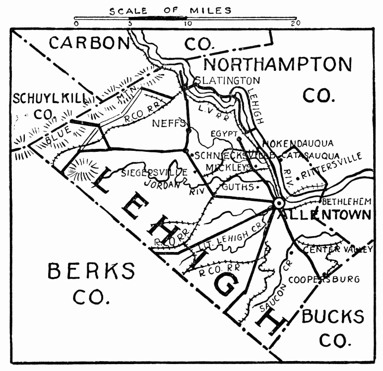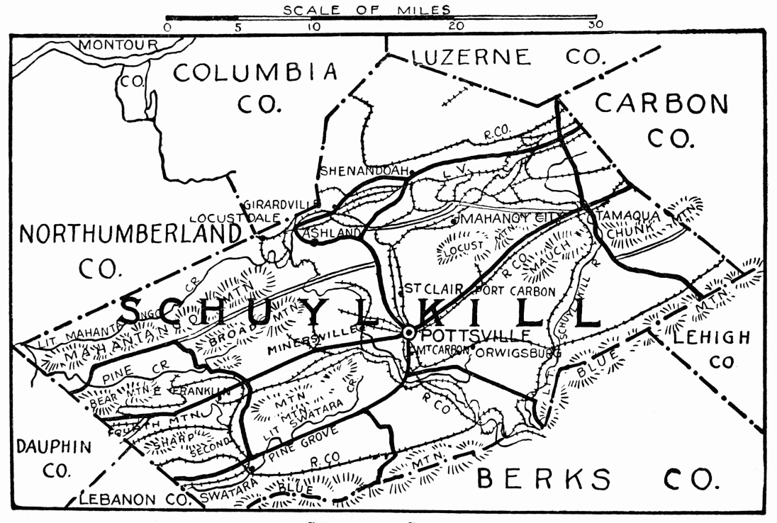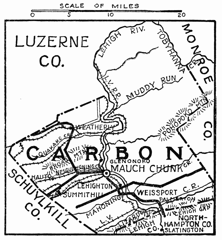 FORMED March 13, 1843; named for its coal deposits; coal was first discovered by Philip Ginter in 1791, on top of Sharp Mountain, now town of Summit Hill, nine miles southwest of Mauch Chunk. In 1818 the Lehigh Navigation Company and the Lehigh Coal Company were formed; under skilful management the almost insuperable obstacles in the way of transportation were overcome; boats 18 feet wide by 25 feet long, two or more hinged together, were floated by artificial freshets on the Lehigh; owing to the great fall in the river and consequent rapidity of its motion, dams were constructed near Mauch Chunk, with sluice gates, invented by Josiah White, a manager of the Navigation Company; they were the first on record used permanently; Lehigh coal is the hardest known anthracite in the world. Other mineral productions are iron, slate, and mineral paint. Wire rope was first invented in Mauch Chunk.