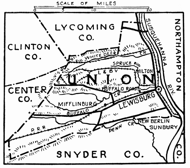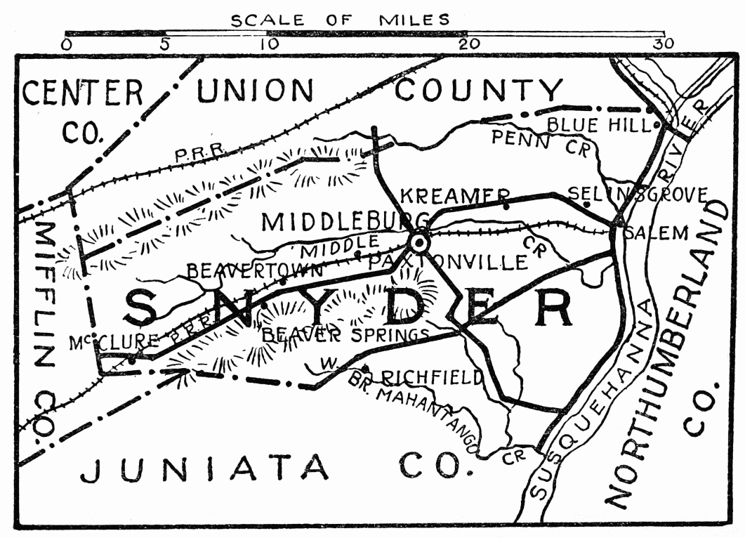 Two miles west is Salem; Row’s Church, log, built, 1780, modernized in 1897. In Kreamer is the old brick hotel used for special sessions of court before 1855, for cases in immediate neighborhood; a short distance in the field stands the old block house, erected before 1781, where white settlers gathered in defense against Indians. One mile farther west, in 1781, Indians killed five members of the Stock family. Ten miles west from Selinsgrove is Middleburg, county seat; 498 feet above sea level; population 984; laid out in 1800. In Glendale Cemetery is grave of Hon. George Kreamer, nephew of Governor Snyder, and member of the Legislature, 1812-13; member of Congress, 1823-27; also grave of Captain Frederick Evans, member of State Legislature, 1810-11, a defender of Fort McHenry, Baltimore, where, in 1814, the “Star-Spangled Banner” was written by Francis Scott Key.{498}