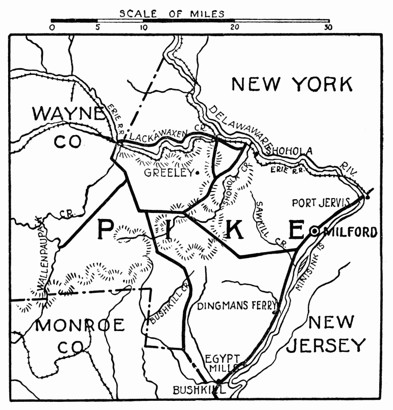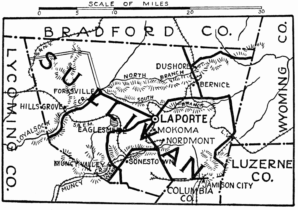 FORMED March 15, 1847, named for General John Sullivan; is noted for picturesque scenery, mountains, valleys, lakes, streams and waterfalls, forests, and distant views. Either the scenic Williamsport and North Branch Railroad or the state highway, that parallel each other and enter the county near Muncy Valley, lead to beautiful Eaglesmere, 1900 feet above sea; on Lewis Lake, one and a half miles long, one-half mile wide; depth never definitely determined, fed by subterranean waters. About the shore, tree bound, with luxuriant growth of rhododendron and laurel, and rock faced to deep water, there are lovely nooks, and a bathing beach of white sand at the northern end. Passing from Eaglesmere through “Celestia,” where the lands were deeded in 1864, by Peter E. Armstrong and wife, to “Almighty God”—the deed may be seen at the county courthouse—one comes to Laporte, population 175; highest and smallest county seat in Pennsylvania, 2000 feet above sea level, with its natural beauties, including “Lake Mokoma,” is also an attractive summer resort. It was laid out in 1850, by Michael Meylert, who owned the land and built the first courthouse; present building, facing the park, is Romanesque; brick; beautiful Lombardy poplar trees are in the yard. Within the last twelve years advanced civilization has penetrated into Sullivan County in good state highways, rural mail{478}