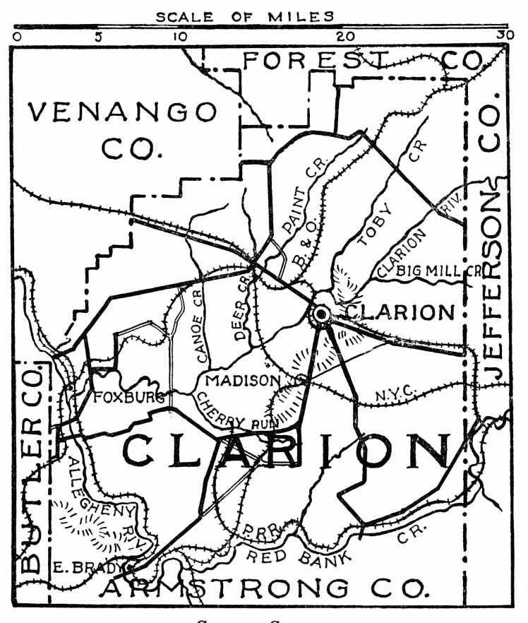 FORMED March 11, 1839; named from Clarion River. The scenery is beautiful and diversified; at the highest point, over 1600 feet above sea level, a flagstaff has been erected; from here, on a clear day, may be seen the bridge at East Brady and four villages in the far distance. Hills and valleys are dotted here and there with oil and gas wells. There are beautiful views along the Clarion and Allegheny rivers and Redbank Creek; the scenery at East Brady is notable on account of the precipitous hills and winding streams. First white settler was Captain Samuel Brady of Revolutionary fame; his parents having been killed by Indians, he swore vengeance against them. He conducted an expedition in 1779 under General Brodhead, who had started with a large force from Fort Pitt. The Indians had become troublesome along the Allegheny River; Brady, in advance with scouts, discovered them on a flat rock at a place which is now East Brady; he took possession of a narrow pass, and when the Indians arrived, he opened fire, with the main army in the rear; escape was impossible, and nearly all were killed or taken prisoners.