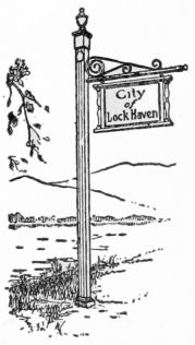 Lock Haven, with advance road signs, county seat; population 8559. Through the efforts of the city government, Board of Trade, and Women’s Civic Club, John Nolen, of Cambridge, Massachusetts, was engaged to prepare a formal “City Plan” for the future growth and development of the city. This plan includes no radical changes or extravagant improvements, but conforms to the requirements of a small community. Embraces simple, but definite plans for the esthetic improvement of the fronts of the Susquehanna and Bald Eagle Rivers, between which Lock Haven is situated. The proper location and grouping of future public buildings, with a civic center at Monument Place, the intersection of the two main thoroughfares.{456}