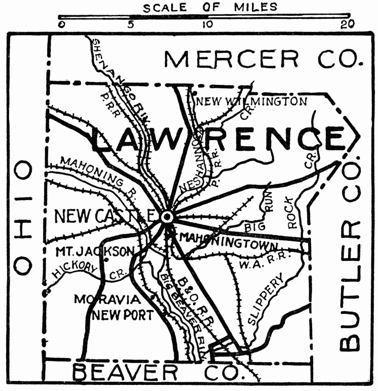FORMED March 20, 1849; named for Perry’s flagship, in the Battle of Lake Erie, which was named in honor of Captain James Lawrence, United States Navy. Lawrence was mortally wounded in the War of 1812, on the frigate Chesapeake, against the British ship Shannon; as he was carried below he said: “Don’t give up the ship.” Chiefly settled by Scotch-Irish. The old canal to Lake Erie, built in 1833, went through center of the county, and did much to develop the resources—bituminous coal, iron ore, and limestone. Chief industries, manufactories and agriculture. Many beautiful drives are all through the county in every direction.