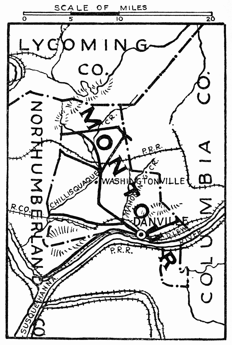 Danville, county seat; population 6952; was settled in 1790; beautifully located, it nestles between Bald Top and Blue Hill. Mahoning Creek, named after a tribe of Indians who peopled this part of the country, flows through the town, which is built on part of the tract of land surveyed on warrant of John Penn to John Lukens, Surveyor General of the United States, dated, January 31, 1769. A bridge built by the state in 1904 is one-quarter mile long and connects Montour with Northumberland County; at its entrance is River Front Park, laid out in 1912, with concrete walks, flower beds, and fountain. Market Street Park, center of town, has an electrically lighted fountain. Memorial Park, a beautiful knoll, was formerly the burial ground of the Presbyterian Church; in 1908 it was laid{494} out as a park with flower beds, and is kept up by the council and public-spirited citizens; the Soldiers’ Monument is here, with two cannon of the Civil War near.