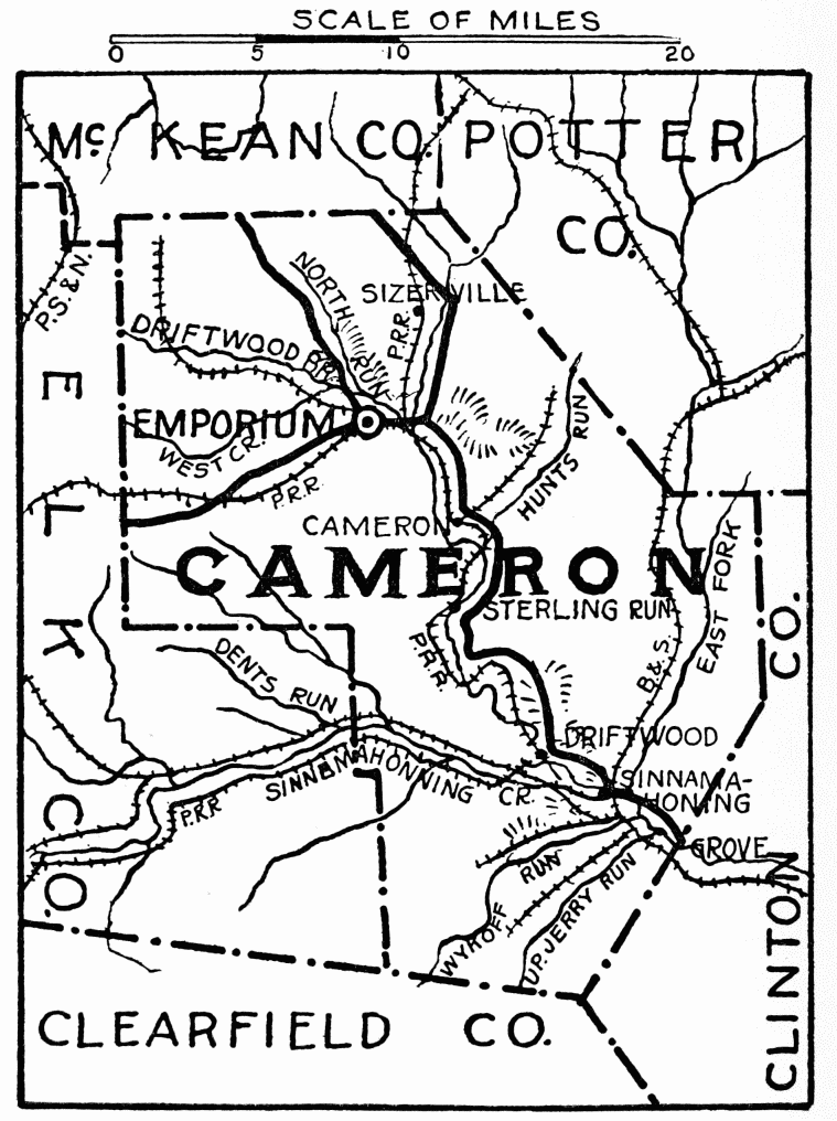 FORMED March 29, 1860; named in honor of Hon. Simon Cameron, state senator at that time. Situated among the spurs of the Alleghenies, altitude varies from 794 feet to 2100 feet above sea level. The Sinnemahoning Creek and its tributaries drain three quarters of the county into the Susquehanna; along these waters, roads were cut and towns built for the extensive early lumbering and tanning operations; primeval forests of hemlock, oak, cherry, elm, and some of the finest white pine in the state. Beds of coal and fire clay still await development. Salt spring and a mineral spring of rare medicinal value are near Sizerville. The county is now largely given up to the manufacture of high explosives, nitro-gelatine, smokeless powder, gun cotton, picric acid; in 1915 there was a merger of four powder companies who created a plant of vast proportions, over one hundred buildings, extending from the edge of Emporium, for over a mile, along the banks of Driftwood Creek.