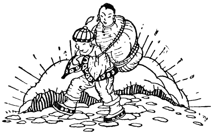 For a long time no one had heard of the coming of Sunshine and Moonshine, for very rarely did any stray traveler or caravan pass the solitary red door in the cliff. But at length, in some mysterious way, the Khan learned of the two lads living with the hermit and sent his soldiers in angry haste to fetch them.