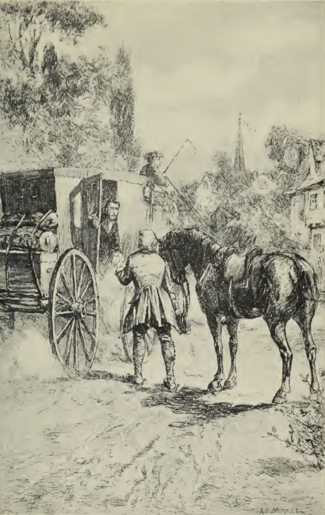 "The courier? Not he, a ferocious looking fellow with never a word to say! The only time I heard him speak was when he ordered the horses, and that didn't take long, allez, monsieur! He jumped from his horse, put two louis d'or in the hand of the maître de poste, and said: 'Six horses for the carriage and one riding-horse, cent sous for the guide, forty sous paid in advance.' And then off he went at a gallop."