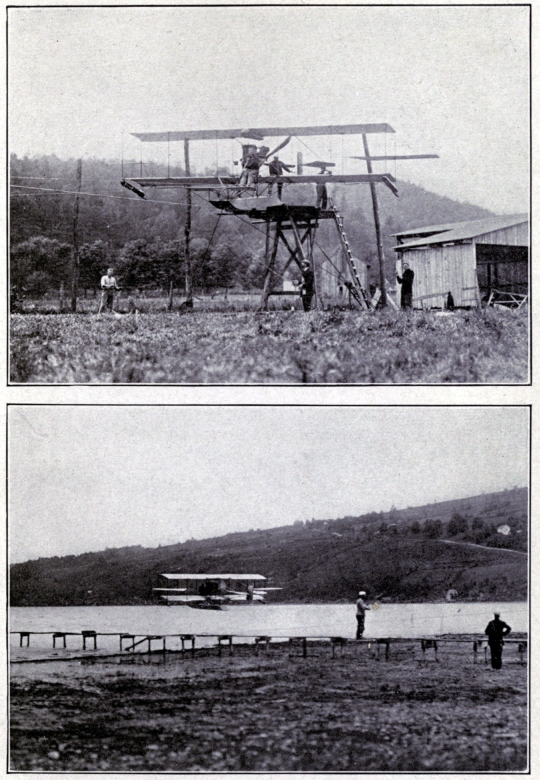 Down on the shore of Lake Keuka, about a half mile from the factory, are the aeroplane sheds and the flying field. Here is where the aviation school is situated, and where flyers are made. Over the smooth field, the pupils start with the four-cylinder "grass cutters," or machines hobbled so they cannot get but a little way off the ground. They hop, hop, hop, almost all day long, one after the other taking regular turns, and now and again varying the monotony by being called away by the flying instructor to take a real flight in the hydroaeroplane out over the lake to get accustomed to the upper air, and to the high speed of the big machine.