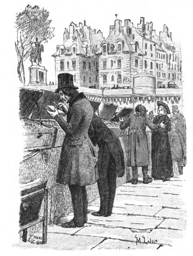 “What has become of the golden age of the outdoor venders of old books? It was here, certainly, that my famous friend Barbier collected his treasures until he was able to make a precise bibliography of several thousand items. It was here that Monmerqué, on his way to the Palais, and wise Labouderie, while leaving the city, walked for hours with instruction and profit. It was from here that old Boulard{48} carried away daily a yard of rarities, measuring them with his surveyor’s cane,—volumes for which there was no place reserved in his six houses stuffed with books. How often on such occasions had he desired the modest angulus[5] of Horace, or the elastic cover of the fairies’ tent, which if necessary could shield the whole army of Xerxes, and which might be carried as easily in one’s belt as the knife-sheath of Jeannot’s grandfather. Now, more’s the pity, you see only fragments of modern literature which will never become ancient, whose life will have evaporated in twenty-four hours, like that of the flies of the river Hypanis: a literature worthy in truth of the charcoal ink and pulp paper used by mercenary printers, who are almost as foolish as the books. It is profaning the name of books to give it to these black-blotted rags, whose des{49}tinies have not even changed in leaving the basket on the rag-picker’s shoulders. The quays henceforth are the morgue for contemporary celebrities.”