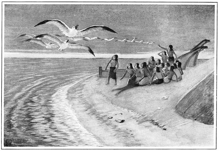 Now the women went down to the water’s edge and swam about, and began slowly to jump out of the water. Five times they swam backward and forward before the village; then they went seaward, swimming very fast. They kept on to the island where Bluejay and his fellows were cooking their food. Bluejay said to the men, “What is this that is coming?” The men looked at the things that were coming, and saw the women often jumping out of the water. Five times they swam around that rock, then they went out to sea. After a while birds came flying after them towards the sea—birds with red bills, just as if blood were on their beaks. They kept following one another, many of them. Bluejay said: “Do you see these birds, how they keep coming? Where do they come from?” Then the Raven said, “How is it that you do not recognize these as your children?” Five times the birds flew around the rock, just as the women had gone around it, and then they flew away out to sea.