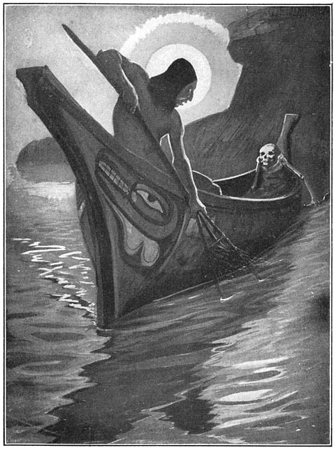 They put their canoe in the water and started, and as they were paddling down the river they saw ahead of them some people, also going down the river in a canoe and singing. When they had almost overtaken them Bluejay began to sing too, joining in their song, and at once the people were silent. He looked back at the boy in the stern of the canoe, but now there was no boy there, only a pile of [38]bones. The noise Bluejay made caused the boy to disappear, and only bones were left. Now, as they floated down the stream, Bluejay sat silent, and was wondering what all this meant, and pretty soon when he looked back at the stern of the canoe the boy was sitting there again. Bluejay said to him, speaking slowly and in a low voice, “Where is your fishing-fence?” The boy answered, “It is beyond here, down the stream.” They went on farther; then Bluejay said out loud and suddenly, “Where is your fishing-fence?” Only bones were in the stern of the canoe. Again Bluejay was silent, and when he next looked back the boy was again in the canoe. Bluejay again spoke to him in low tones, and said, “Where is your fishing-fence?” The boy answered, “Here.”