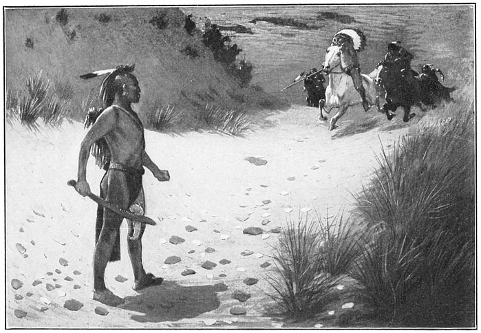 In this way, after many days, they came to the Little (Milk) River. The pouch had long been empty, and Su-yé-sai-pi was weak from hunger, and her weary feet were swollen and blistered, for the last pair of moccasins had been worn out. Here by the river were plenty of berries and some roots that are often eaten—good to fill the belly, but not strength-making food. Of them she ate all she could, and frequently bathed her feet, and kept on up the valley; but every day she went more slowly. The stops for rest were more frequent now, and the coyote showed that he was beginning to feel uneasy. When he thought she had sat still too long, he would whine and paw at her dress, and look away up the stream, urging her to go on. He himself fared well on the ground-squirrels [233]and prairie-dogs he managed to catch, and often he brought one to her; but she could not bring herself to eat it raw, and she had no way of building a fire to roast it.