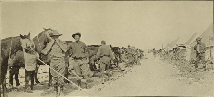 And no sooner was the call made for volunteers for foreign service than they did roll up–they went swarming in thousands to the recruiting stations at Sydney, Melbourne, Adelaide, Brisbane, Hobart, Perth, and other great centres, and in a very short time more than the required number had been enrolled and were rapidly gathered into vast camps at Broadmeadows, at Helena Vale, {9} and elsewhere, and all the States of the Commonwealth were humming with warlike preparations. The militia were called out; Rifle Clubs were formed; the women organised for Red Cross work and to look after the needs of the soldiers and their families; troops slept by their guns in the forts round the coast, for German cruisers were prowling then in the Pacific and the Indian Ocean and there were possibilities of raids and bombardments. Negotiations were opened with the Imperial Government, which readily granted a War Loan of £18,000,000. There was prompt seizure of German and Austrian ships lying in Australian ports; there was a drastic hunting down of German spies and rounding up of alien enemies. Word that war had been declared was received on the morning of the 5th August, and at noon of the same day Australia's first shot was fired from the fort at Point Nepean, when a German cargo steamer, the Pfatz, was held up and captured. The first expeditionary force was raised within two or three days; and before the end of August a second large contingent had been formed and had gone into camp for training, this second contingent including a Light Horse Brigade; and "the Australian Light Horse," as Lord Denman, sometime Governor-General of the Commonwealth, has said, "is the finest Light Horse in the world."