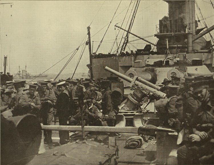 In the afternoon of 23rd April an impressive battle service was held aboard the crowded transports, and soldiers and sailors stood bare-headed and listened reverently whilst the chaplain prayed for them, and that, fighting a clean fight for the rights of humanity, they might be strengthened to go on unflinchingly in the face of every difficulty and danger till their arms were crowned with victory. It was the last consecration of those brave men to the high and perilous duty to which they had given themselves. In the evening of the same day transports carrying the troops who were to make the first landing on Gallipoli, and act as a covering force for the main army, moved out of Mudros Bay, with their {64} convoy of warships, and the rest of the expedition followed in their track–a mighty fleet of nearly a hundred transports in all, guarded on every side by a wonderful array of gunboats, destroyers, swift armoured-cruisers, and stately dreadnoughts, including the mammoth Queen Elizabeth.