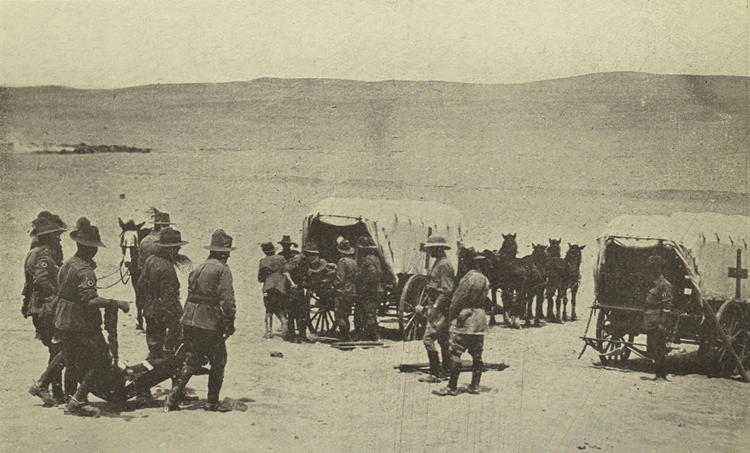 Both sides were well supplied with artillery, and all day the merciless struggle raged with growing fury; in repeated attacks and counter-attacks first the Turkish, then the British lines swayed this way and that, but always straightened out again and could at no point be broken through. A dozen times the Turks flung themselves forward in dense masses, and when they shattered and came thundering in over and past the wire entanglements, the British leaped from their trenches to meet them and fell upon them with spades and bayonets till they fled panic-stricken, leaving their dead and wounded heaped about the ground.