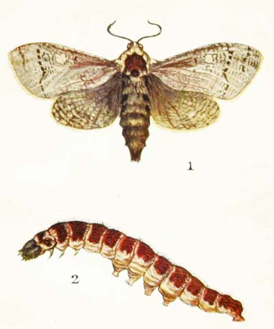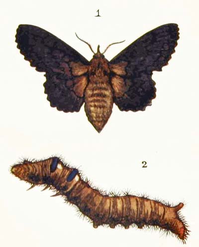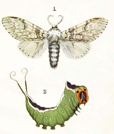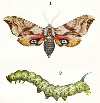 The caterpillar of this beautiful moth feeds on the leaves of willows, sallows, and poplars. It is rather oddly shaped, for its back is very much arched, while its lower surface is almost flat. And, if you touch it, it only clings more tightly to its foothold, instead of curling up into a ring and dropping to the ground, as most caterpillars do. In colour it is ashy-grey, and generally has two dark, wavy stripes running along the back. When it is fully fed it spins a silken cocoon, either between two leaves or in a crack in the bark, and changes to a reddish-brown chrysalis covered with purple bloom, just like that on a ripe plum.