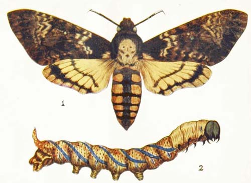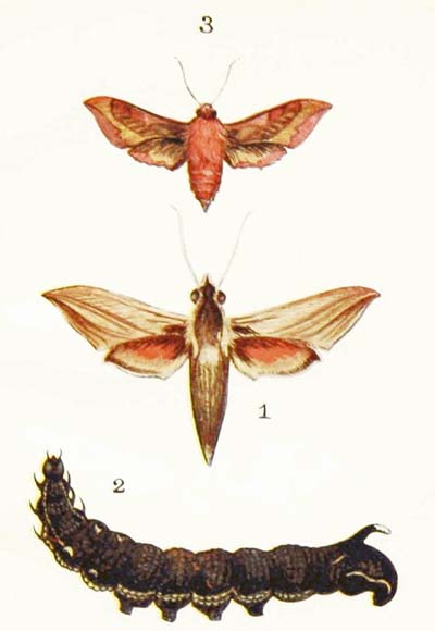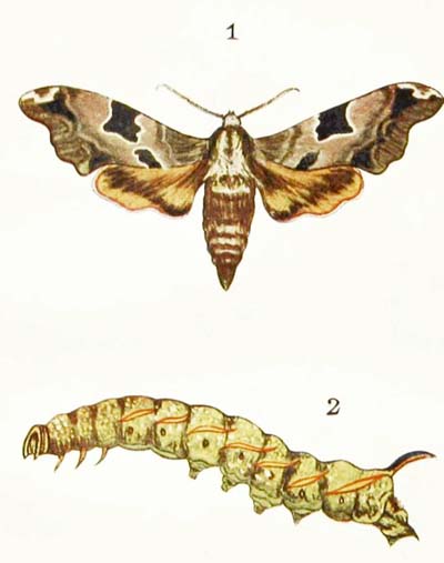 Most people know the caterpillar of this moth a good deal better than they know the moth itself. I dare say that you have often seen it crawling about in August and September, always walking very fast, as though it were in a great hurry. It is a big, rather hairy creature of a dull yellow colour, with a black head, and with nine black stripes running along its body; and you may find it in numbers, feeding on the leaves of elm, lime, and willow trees. Very often, indeed, it is so plentiful that it strips whole branches of their leaves. When it reaches its full size it comes down from the tree, wanders off to some little distance, hides away under dead leaves or at the roots of a tuft of grass, and turns into a dark brown chrysalis, out of which the moth hatches in the following May or June.