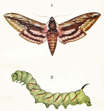 This is one of the handsomest of all our British moths, and the caterpillar is even more beautiful than the moth. For it is of the brightest apple-green colour, with ten or eleven velvety-black rings round its body; and every ring has a number of raised pink spots upon it, with six black bristles springing from each spot, and spreading outwards in the form of a star. You may often find it on bramble-leaves early in September, and it also feeds on blackthorn, willow, and heath.