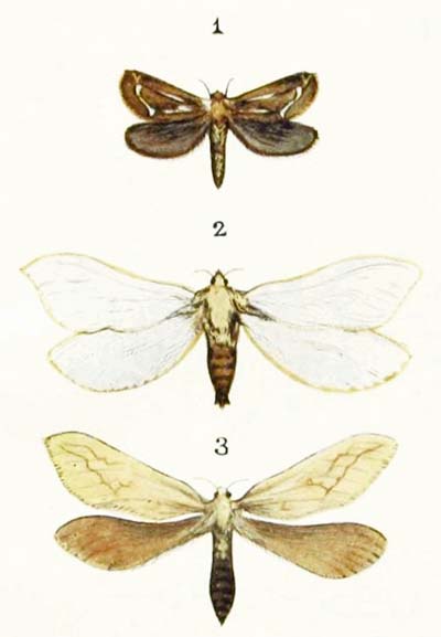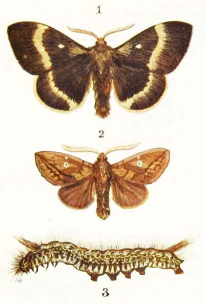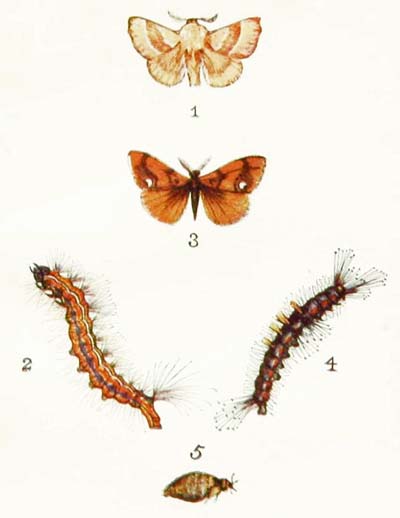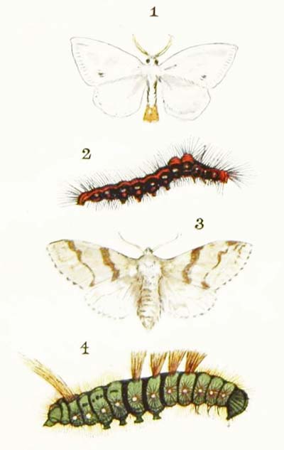 If you want to find this handsome moth, the best way to do so is to shake the branches of fir trees with a long stick during the month of May. Then you are almost sure to see it flying off in a great hurry to seek for refuge somewhere else. But it never seems quite happy unless it can hide away among the needle-like leaves of a fir tree. The male is very different in appearance from the female, for his wings are either white or yellowish-white in colour, with a broad black border, while hers are orange-brown all over, with only two narrow dark bands. And, besides that, his feelers are beautifully plumed, while hers are just like threads. In fact, the male and female are so unlike one another that, if you did not know what they were, you would be almost sure to take them for two perfectly different insects.