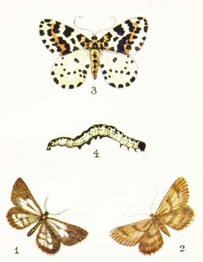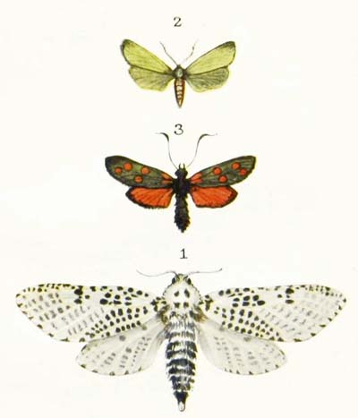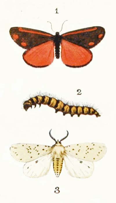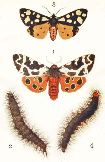 This is a very common moth indeed, and you may shake it out of the bushes in almost any garden in July and the early part of August. And you may also find its caterpillars feeding on the leaves of currant and raspberry and gooseberry bushes. It is creamy-white in colour, with rows of large black spots, and a yellow stripe along each side, and turns into a dark brown chrysalis with orange bands round it. And it seems to have a very nasty taste, for no bird will ever attempt to eat it.